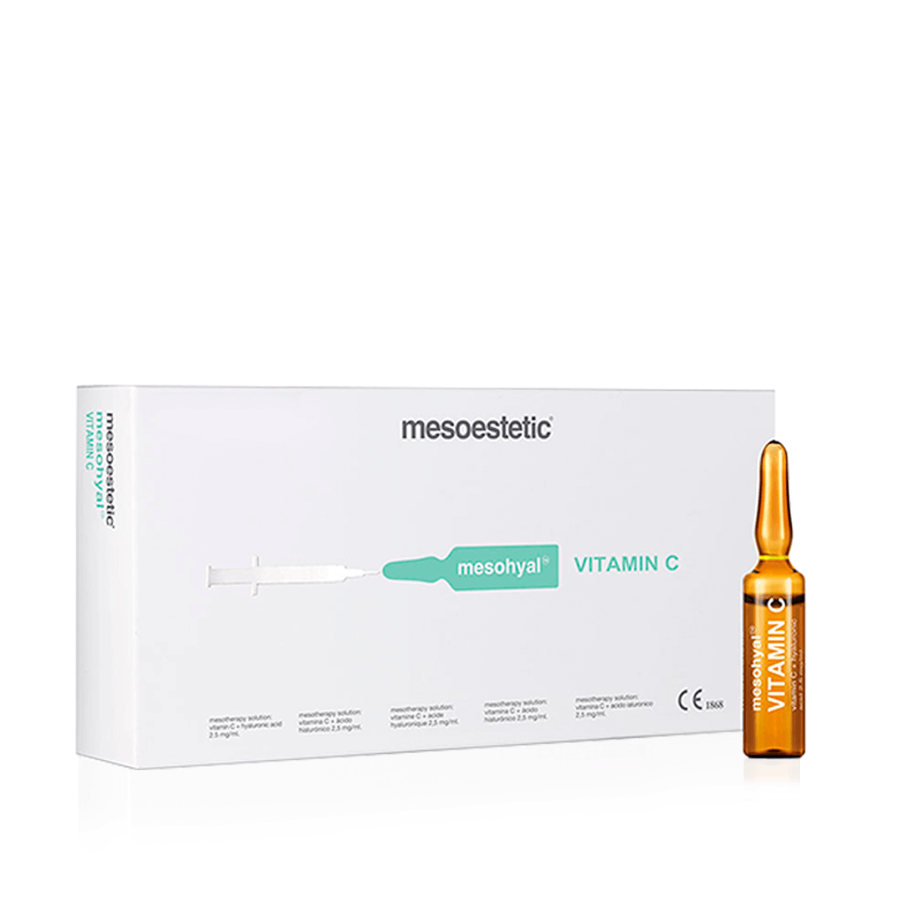 Mesohyal Vitamin C provides an antioxidant and brightening action, based on a blend of 20% ascorbic acid (vitamin c), mineral salts (sodium carbonate hydrogen, sodium sulphite, sodium edetate) and a non-cross linked hyaluronic acid. It is indicated to use as antioxidant and UVA/ UVB photo-protection, and as a treatment for dull and papery skin, melisma, lack of firmness, and hair loss.